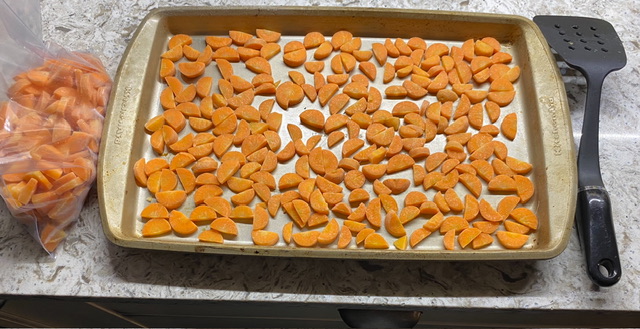 I started with slicing carrots, blanching them for 2 min, putting them in ice water and then scooping them onto a tea towel lined baking sheet. I dried them as much as I could then dumped the towel onto the baking sheet. After freezing overnight, it was easy enough to use a spatula to remove them from the trays and put into a large ziplock.