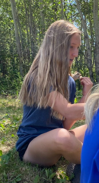 I finished up in the garden and went to pick Saskatoons. Earl followed me across our property to the far bush area. He was hopping from tree to tree asking for peanuts. I walked outside the trees to a different picking spot and he didn’t return. Merle found me shortly after, again quite aways away from the house, picking Saskatoons near our other neighbour’s property line. For some reason they were desperate for peanuts today.