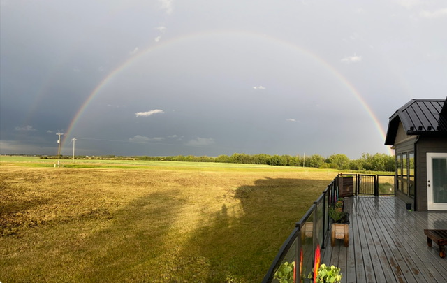 Yesterday we had a beautiful rainbow after a nice steady rain and rolling thunderstorms. I am not sure I have ever seen a full rainbow from end to end before. I took a panoramic shot of it. It is a bit hard to see the colours.